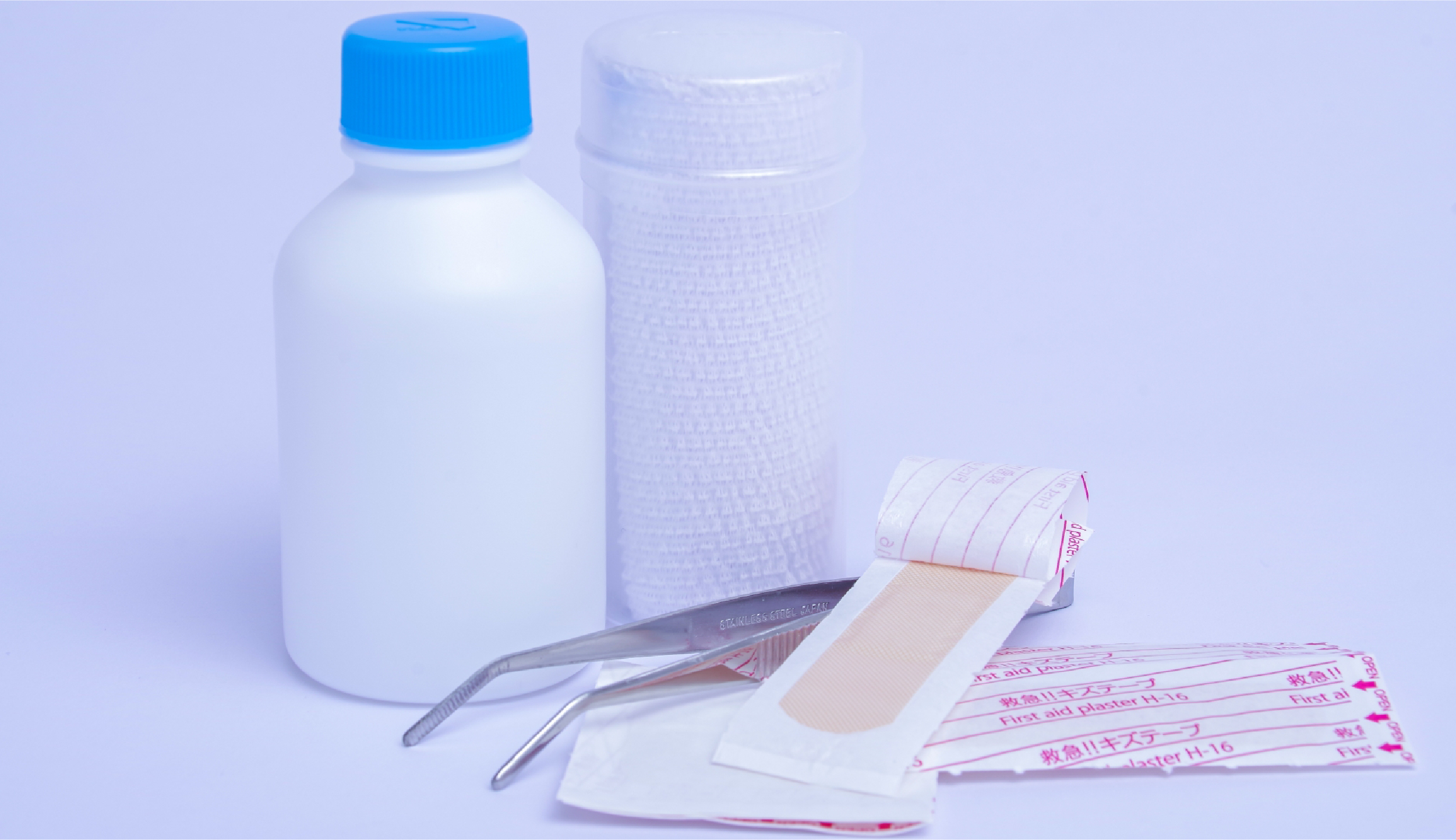 絆創膏、消毒薬、ガーゼなどの最低限の処置道具と常備薬もセットにして用意を。