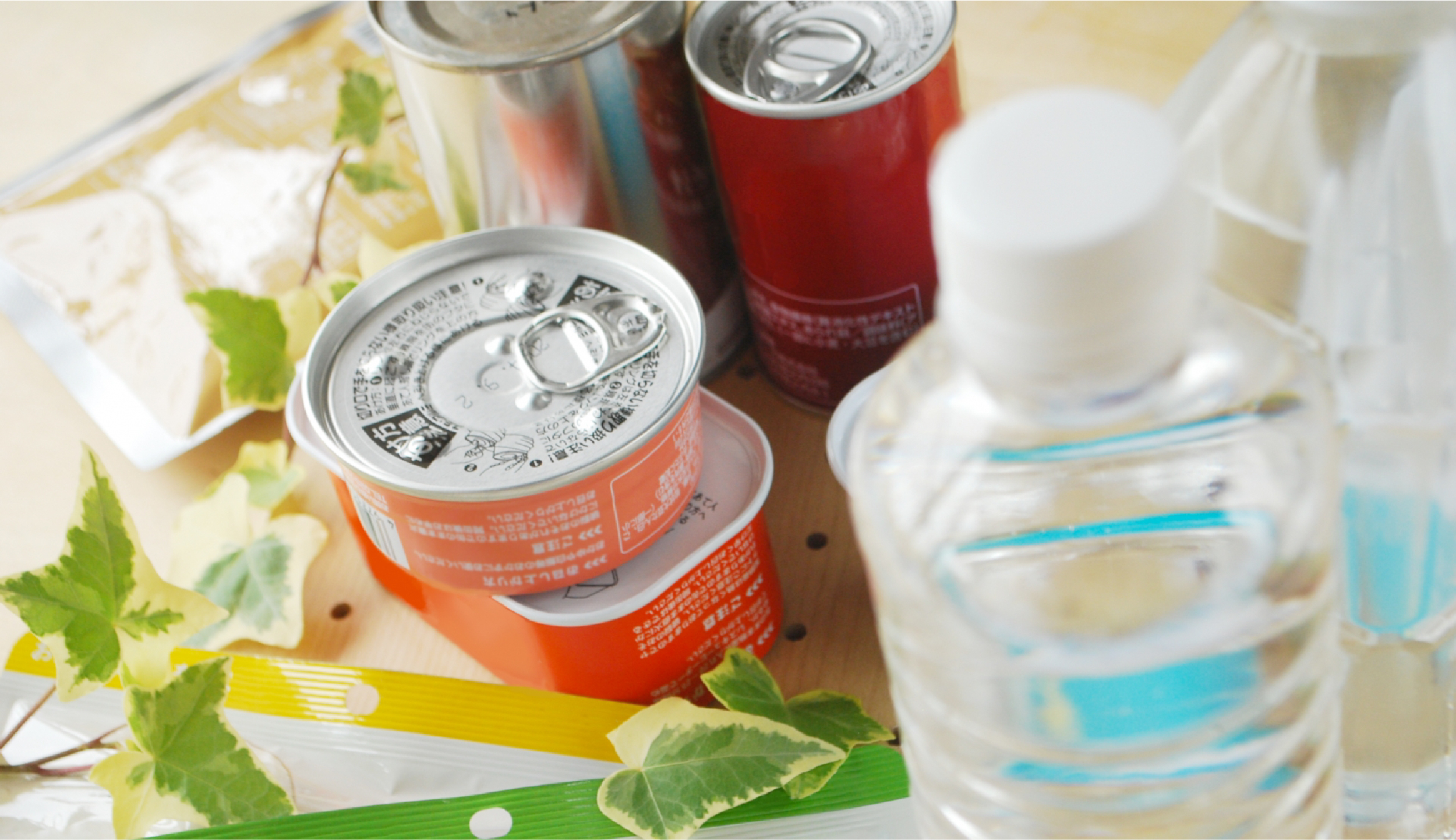 長持ちする保存水と非常食や缶詰、お菓子などなるべく高カロリーのものを。