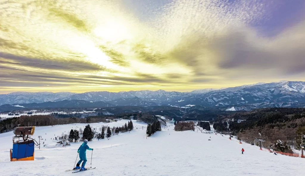山頂から尾根づたいに滑り降りる。白山連峰が眺望でき、横幅が広いため初心者でものんびり滑れる。