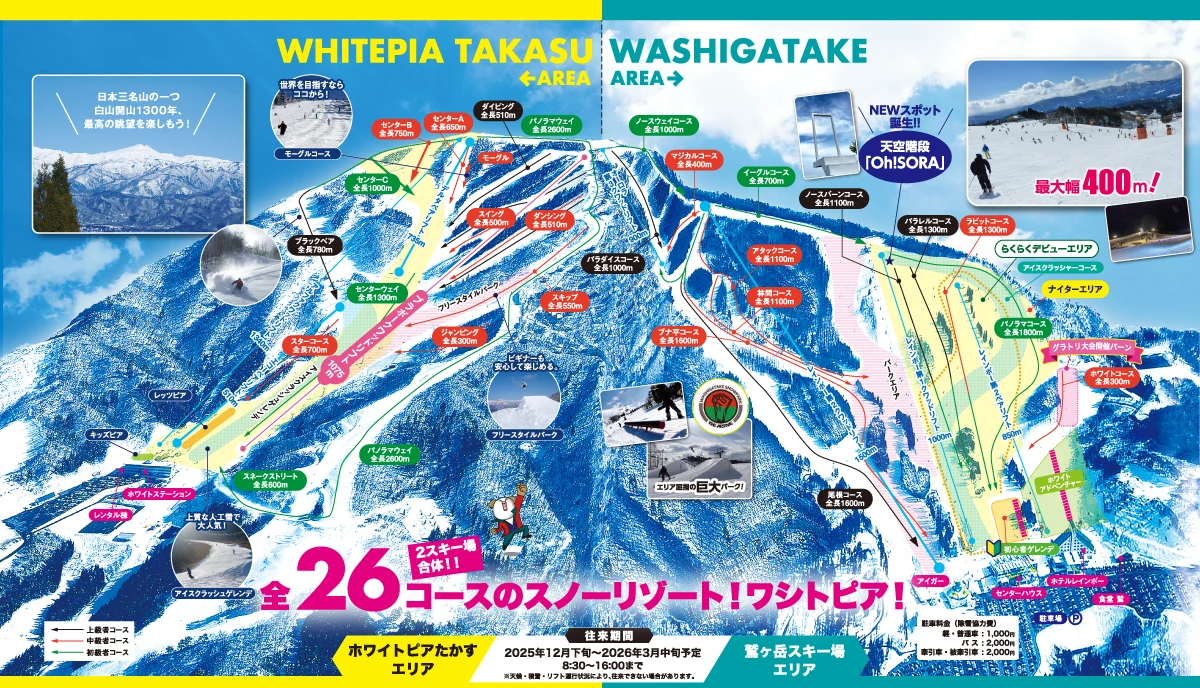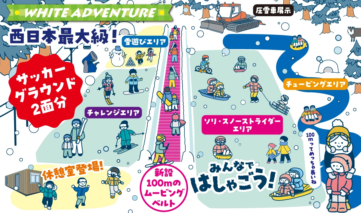 全長1,800m、スノーマシン重点コースのため、シーズンインからベストコンディションが楽しめる。緩やかな斜面はビキナーボーダーの練習に最適。
