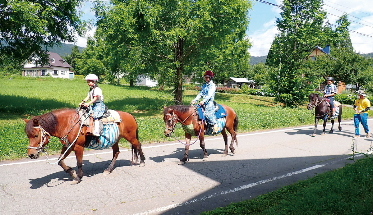 おとなしくて人懐っこい木曽馬に初心者の方でも柵内での引き馬乗馬や、外乗馬をお楽しみいただけます。